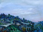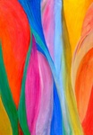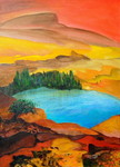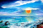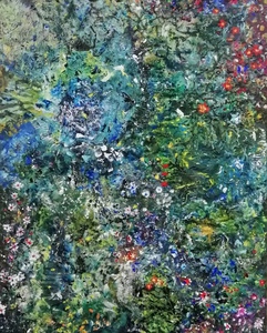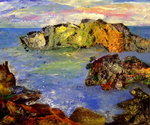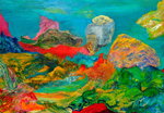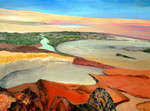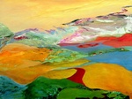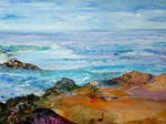 2010Dit werk vormt het middenstuk van een drieluik. De zijpanelen zijn 40/50 cm. Uitgestulpte aardkorst, laag na laag steeds dieper zichzelf tonend in wonderlijke kleuren en diepten, door zonlicht beschenen, steeds verfrist door de golven.